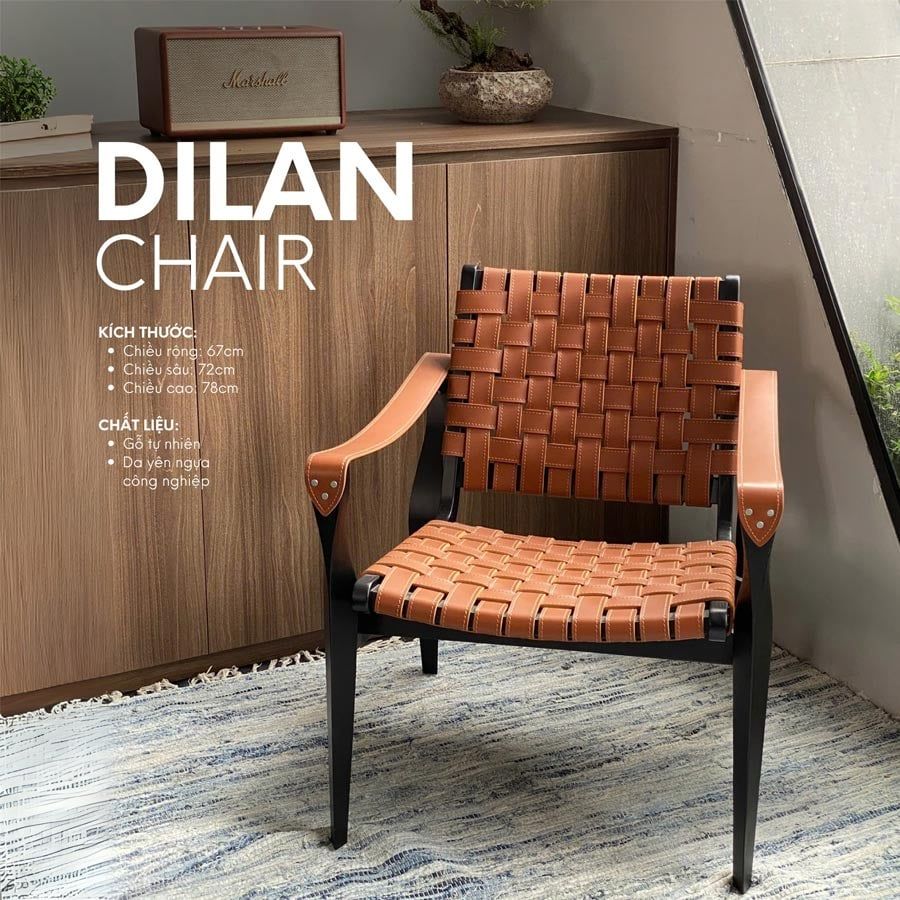 Ghế Dilan thích hợp cho không gian phòng khách, ban công, studio nghệ thuật hoặc các không gian nghỉ dưỡng như resort và homestay phong cách rustic, mộc mạc.
