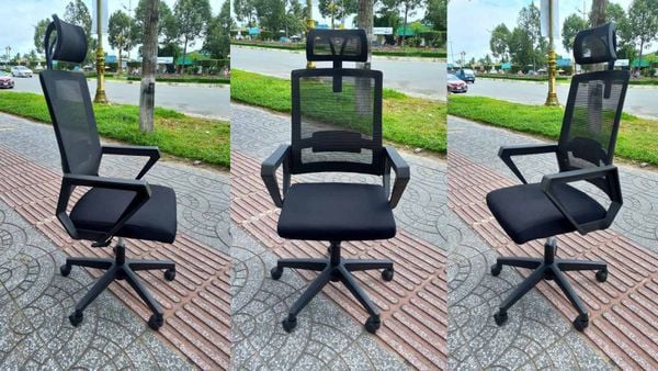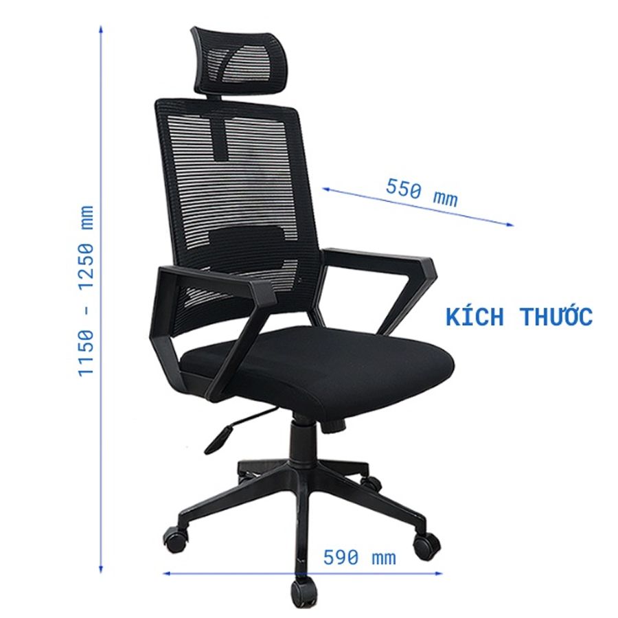 Chất liệu: Lưng nhựa bọc lưới, tay nhựa, đệm mút bọc lưới, chân xoay, có tựa đầu