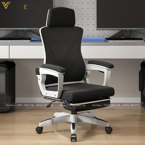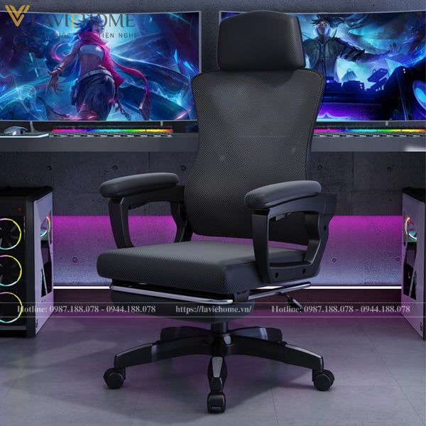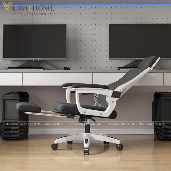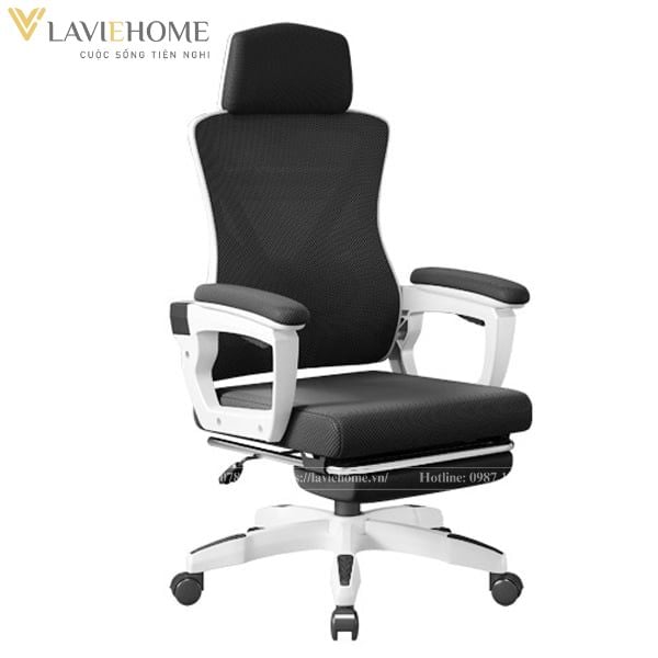 Chất liệu: Lưng nhựa bọc lưới, tay nhựa bọc đệm, đệm mút bọc lưới, chân xoay nhựa đúc, có tựa đầu, gác chân