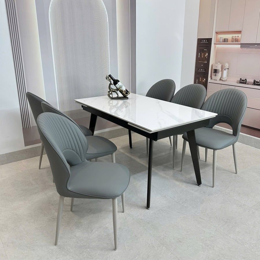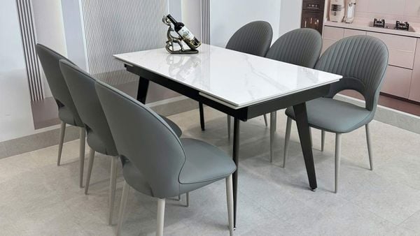Bộ bàn ăn mặt đá HAK57 kết hợp ghế HAG7 mang đến vẻ đẹp tinh tế, hiện đại và vô cùng sang trọng cho không gian phòng ăn. Mặt đá ceramic vân mây trắng sáng giúp không gian rộng hơn, sạch hơn và dễ dàng vệ sinh hằng ngày.