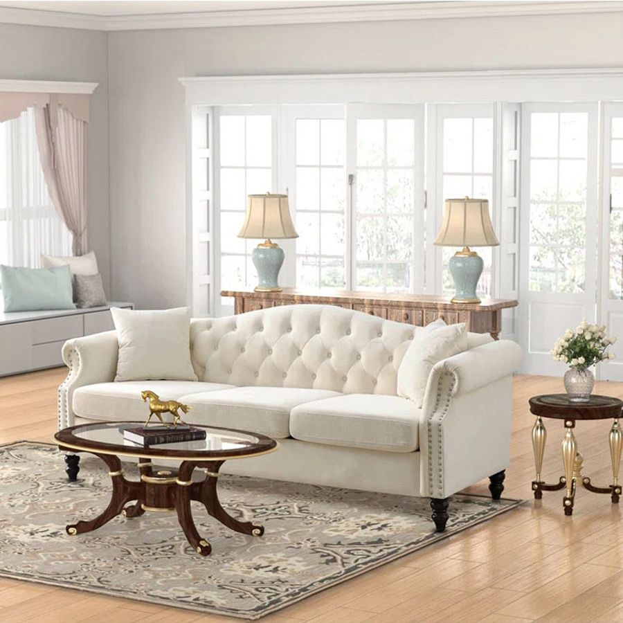 Sofa Chesterfield LHSF27 mang đậm dấu ấn phong cách tân cổ điển Anh quốc, nổi bật với phần tựa lưng bọc rút nút hình quả trám và tay cuộn tròn sang trọng. Thiết kế chân cao uốn lượn kết hợp cùng hàng đinh tán đồng cổ chạy dọc tay vịn tạo nên điểm nhấn thanh lịch và đầy khí chất quý tộc.