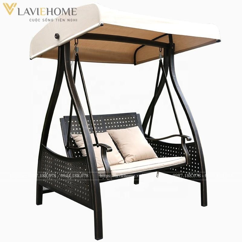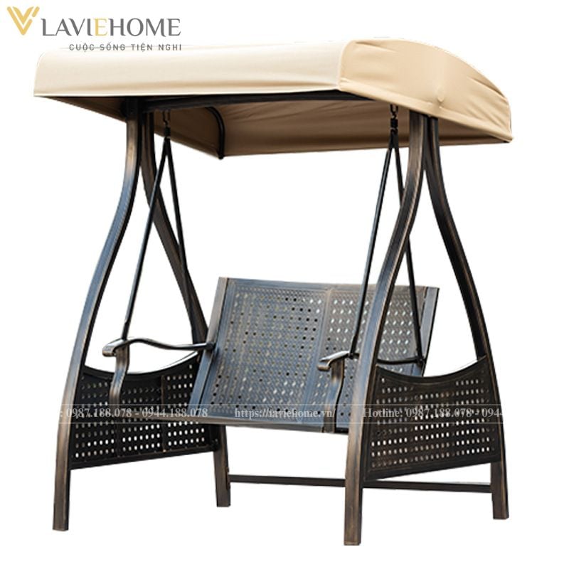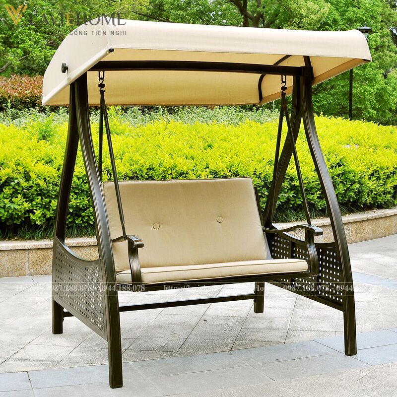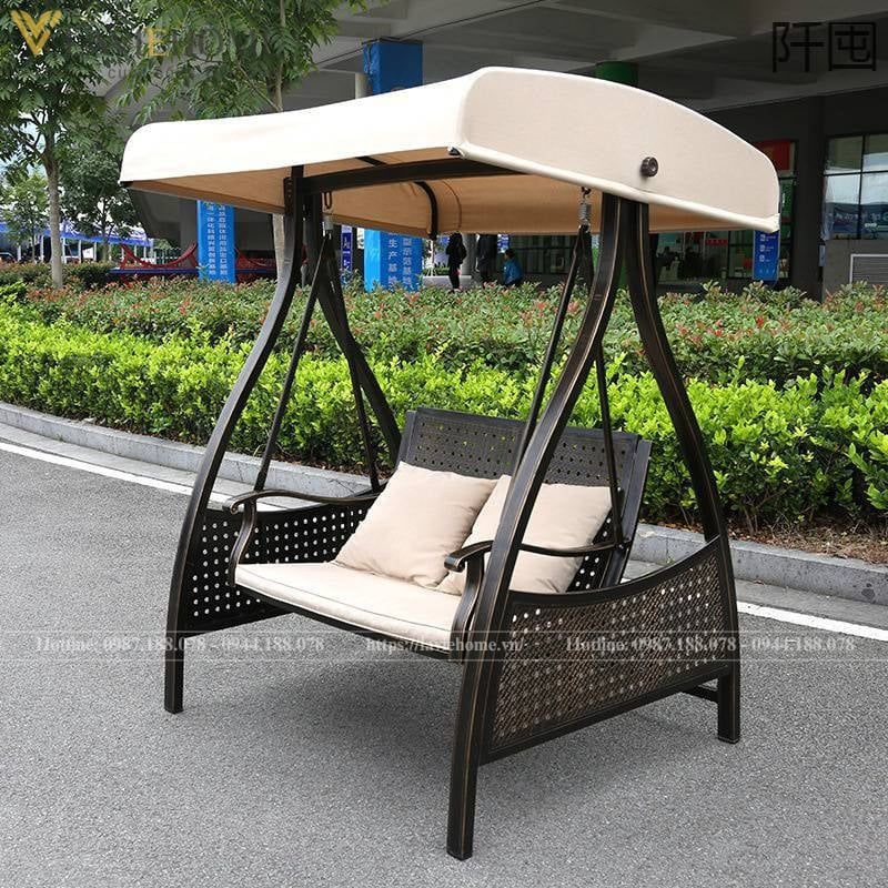 Xích đu 2A có khung thân tinh gọn nhưng chắc chắn. Lớp đệm và mái che đều mang tông màu be ấm áp, đem đến cảm giác dễ chịu cho người nhìn.
